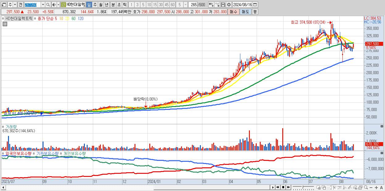 - HD현대일렉트릭 (297,500원 ▲ 8.58% , 시총: 107,240억, 거래량: 670,302, 거래대금:1,974억)