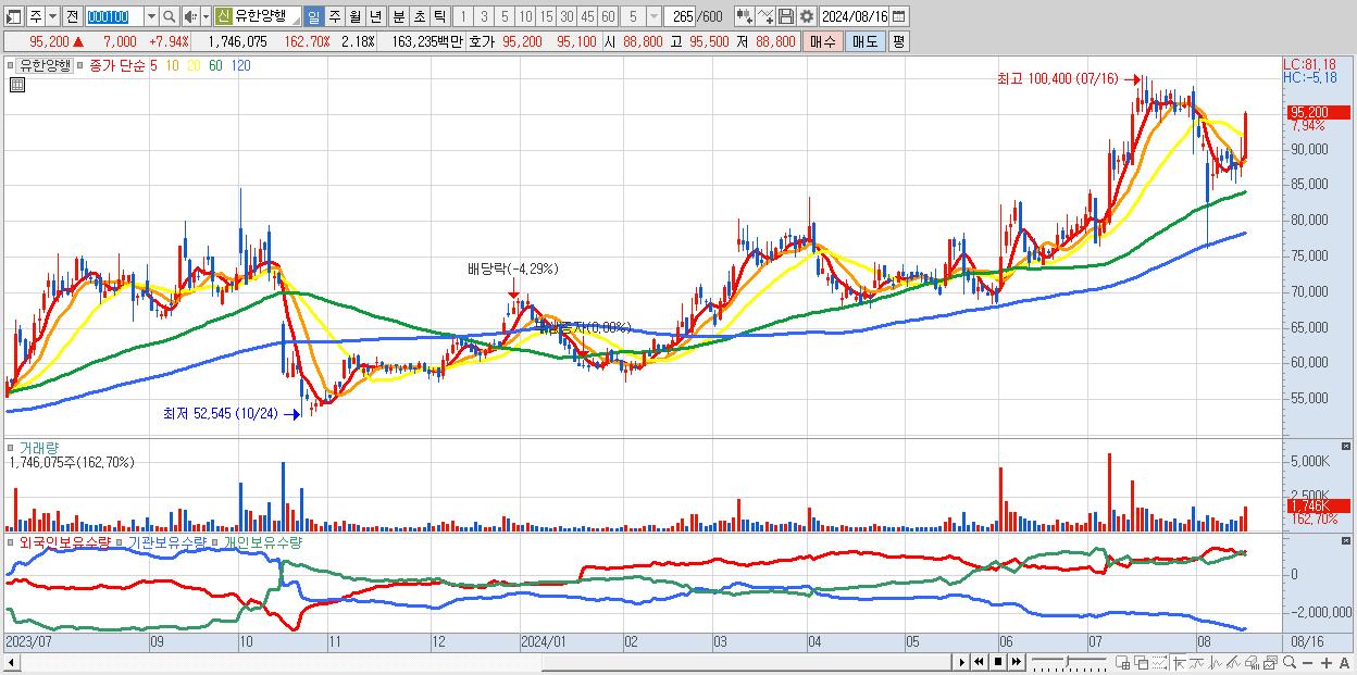 - 유한양행 (95,200원 ▲ 7.94% , 시총: 76,359억, 거래량: 1,746,075, 거래대금:1,632억)