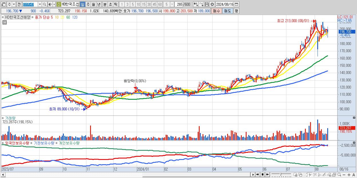 - HD한국조선해양 (196,700원 ▼ -0.46% , 시총: 139,211억, 거래량: 723,287, 거래대금:1,407억)