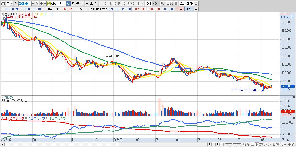- 삼성SDI (320,500원 ▼ -0.93% , 시총: 220,390억, 거래량: 374,911, 거래대금:1,215억)