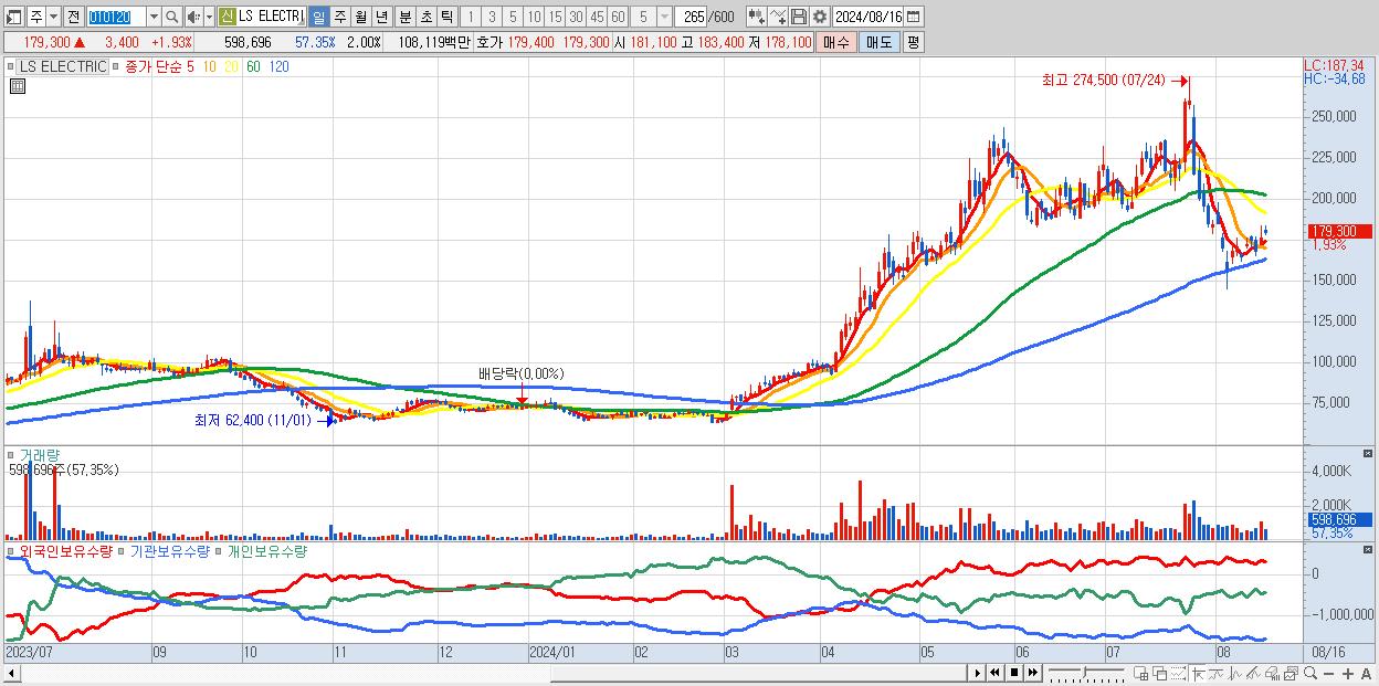 - LS ELECTRIC (179,300원 ▲ 1.93% , 시총: 53,790억, 거래량: 598,696, 거래대금:1,081억)