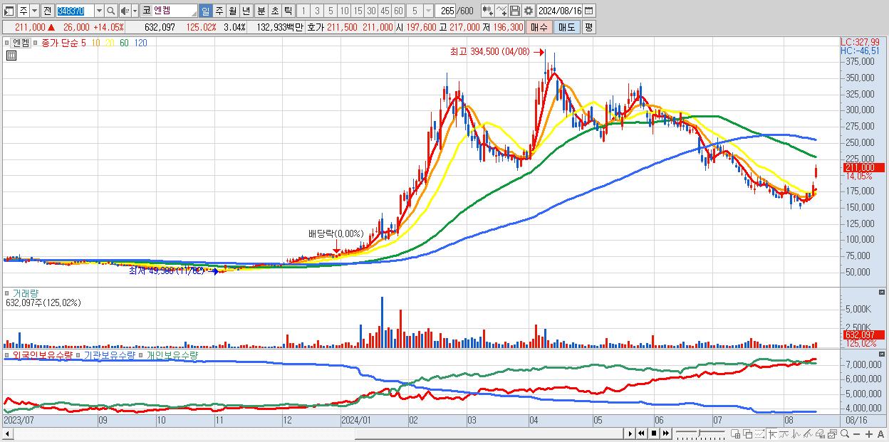 - 엔켐 (211,000원 ▲ 14.05% , 시총: 43,860억, 거래량: 632,097, 거래대금:1,329억)