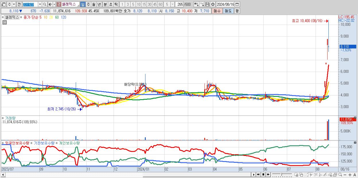 - 셀레믹스 (8,110원 ▼ -7.63% , 시총: 662억, 거래량: 11,874,616, 거래대금:1,098억)