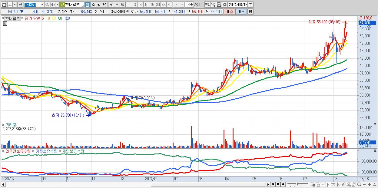 - 현대로템 (54,400원 ▼ -0.37% , 시총: 59,373억, 거래량: 2,497,218, 거래대금:1,355억)