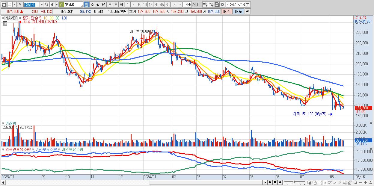 - NAVER (157,500원 ▲ 0.13% , 시총: 255,794억, 거래량: 825,934, 거래대금:1,307억)