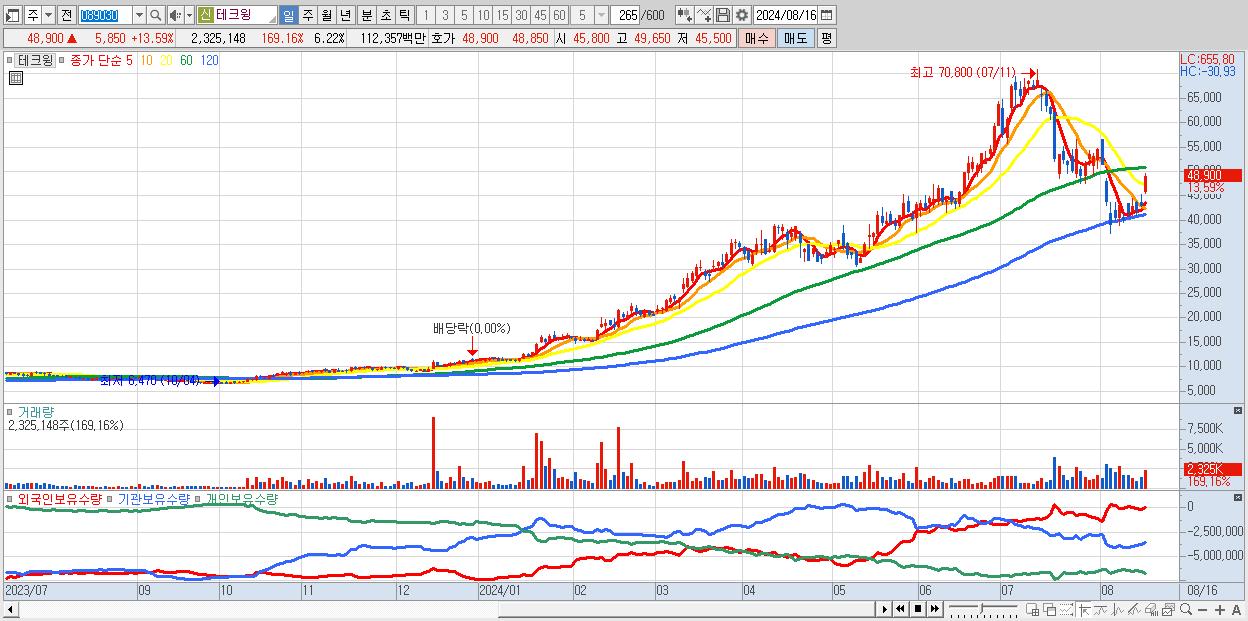 - 테크윙 (48,900원 ▲ 13.59% , 시총: 18,266억, 거래량: 2,325,148, 거래대금:1,124억)