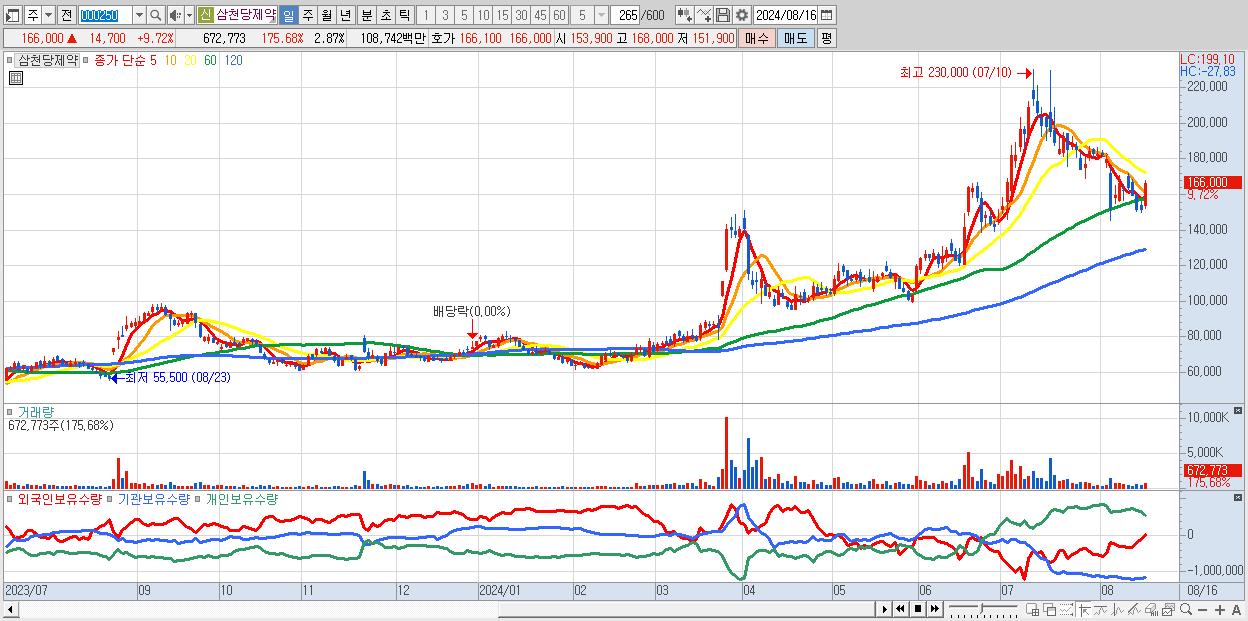 - 삼천당제약 (166,000원 ▲ 9.72% , 시총: 38,939억, 거래량: 672,773, 거래대금:1,087억)