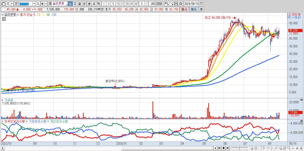 - 실리콘투 (45,200원 ▲ 11.88% , 시총: 27,515억, 거래량: 7,535,800, 거래대금:3,382억)