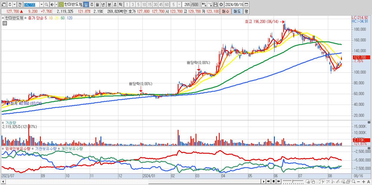 - 한미반도체 (127,700원 ▲ 7.76% , 시총: 123,861억, 거래량: 2,119,325, 거래대금:2,698억)