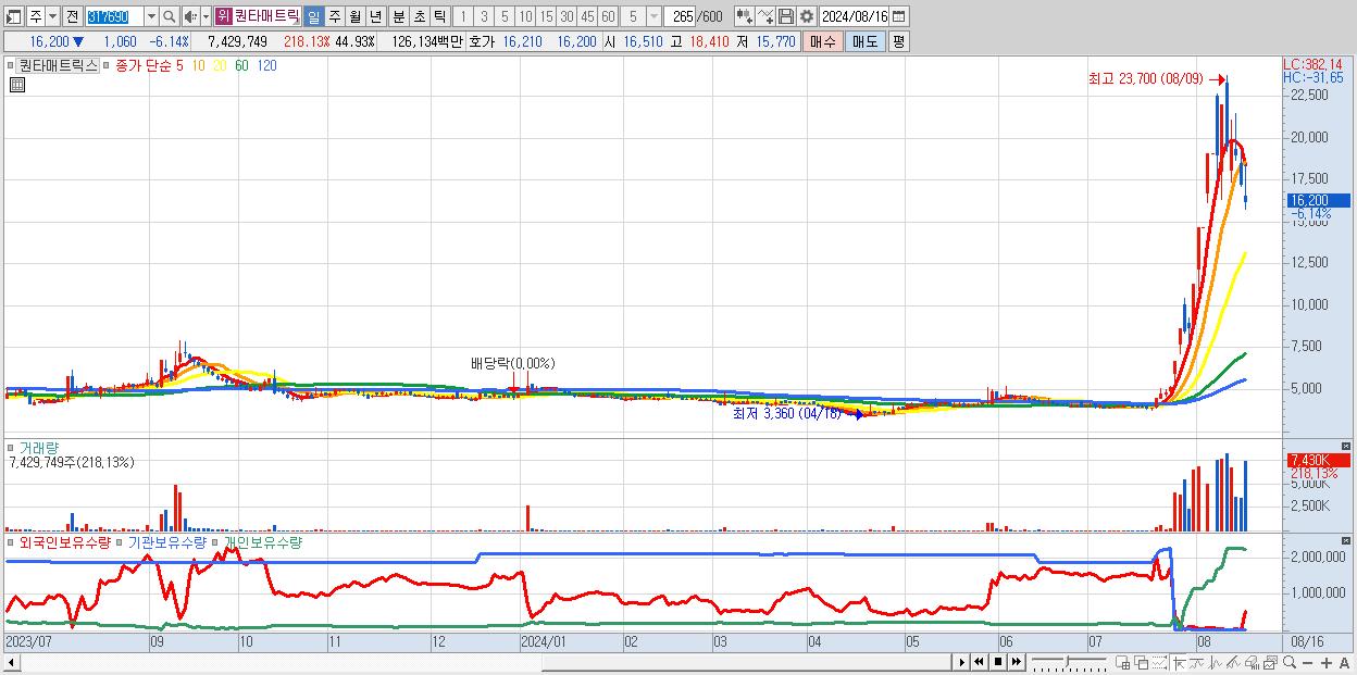 - 퀀타매트릭스 (16,200원 ▼ -6.14% , 시총: 2,679억, 거래량: 7,429,749, 거래대금:1,261억)