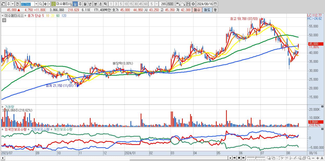 - 이수페타시스 (45,000원 ▲ 11.8% , 시총: 28,461억, 거래량: 3,866,068, 거래대금:1,714억)