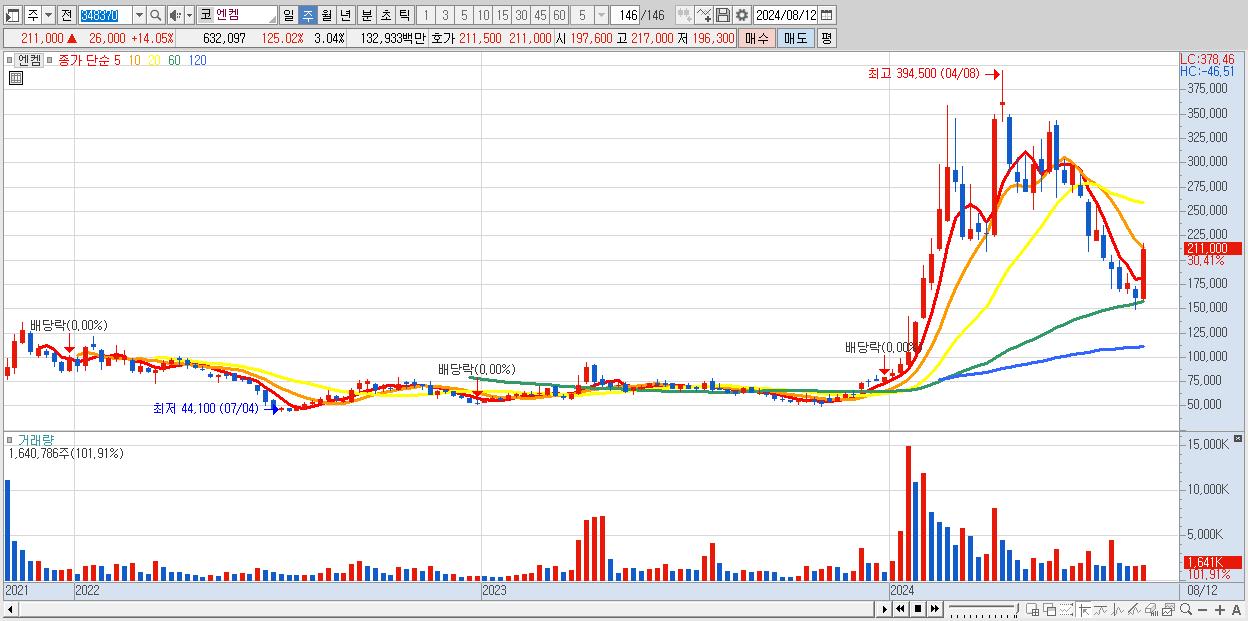 - 엔켐 (211,000원 ▲ 30.41% , 시총: 43,860억, 거래량: 1,640,786, 거래대금:3,102억)