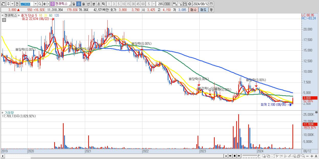- 젠큐릭스 (3,800원 ▲ 52% , 시총: 549억, 거래량: 17,769,133, 거래대금:625억)