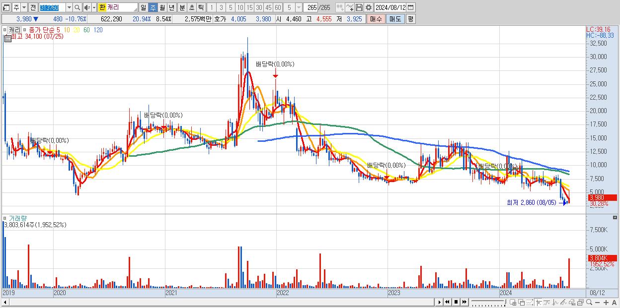- 캐리 (3,980원 ▲ 30.28% , 시총: 290억, 거래량: 3,803,614, 거래대금:180억)