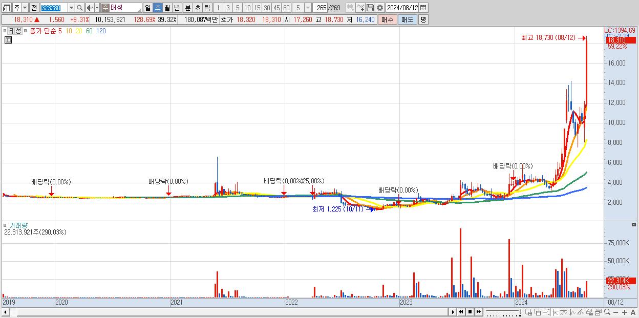 - 태성 (18,310원 ▲ 59.22% , 시총: 4,728억, 거래량: 22,313,921, 거래대금:3,581억)