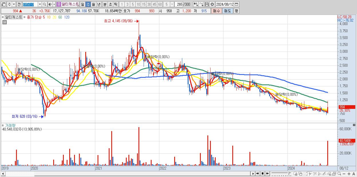 - 알티캐스트 (994원 ▲ 26.3% , 시총: 295억, 거래량: 40,548,032, 거래대금:437억)