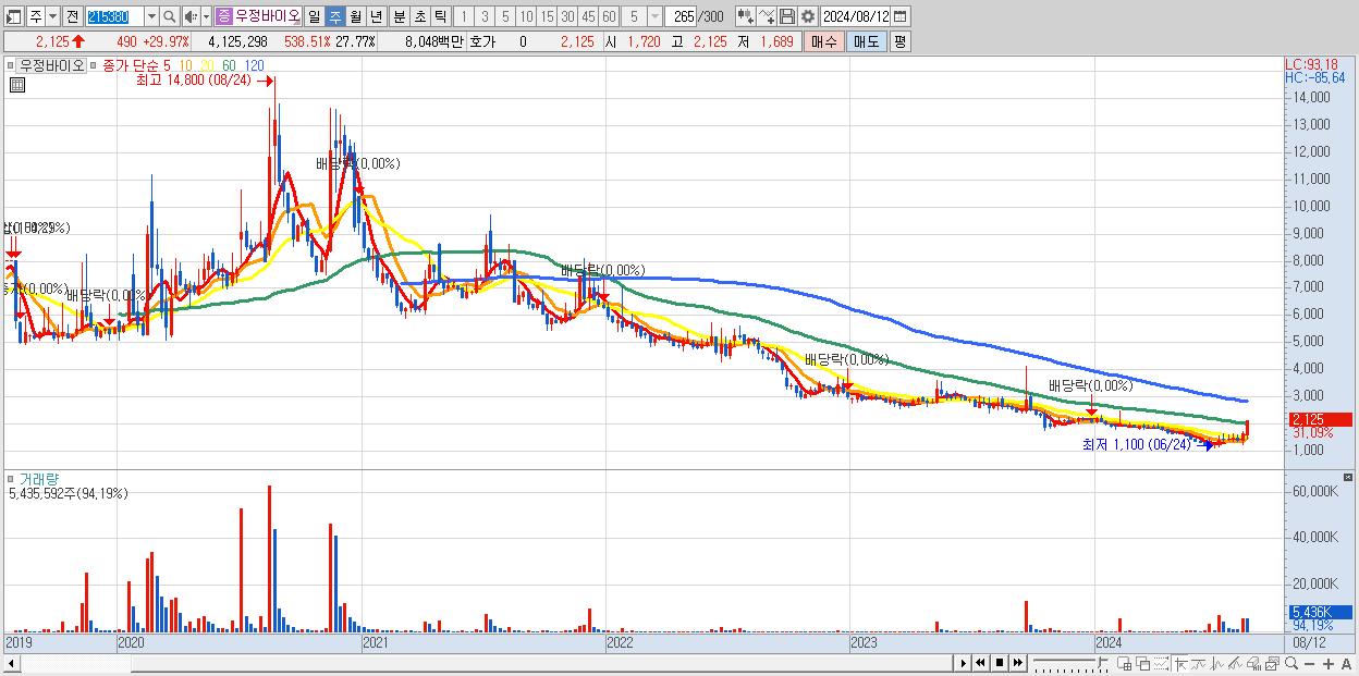 - 우정바이오 (2,125원 ▲ 31.09% , 시총: 316억, 거래량: 5,435,592, 거래대금:101억)