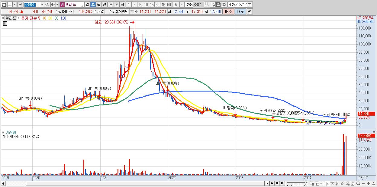 - 셀리드 (14,220원 ▲ 80.23% , 시총: 1,934억, 거래량: 45,879,498, 거래대금:5,613억)