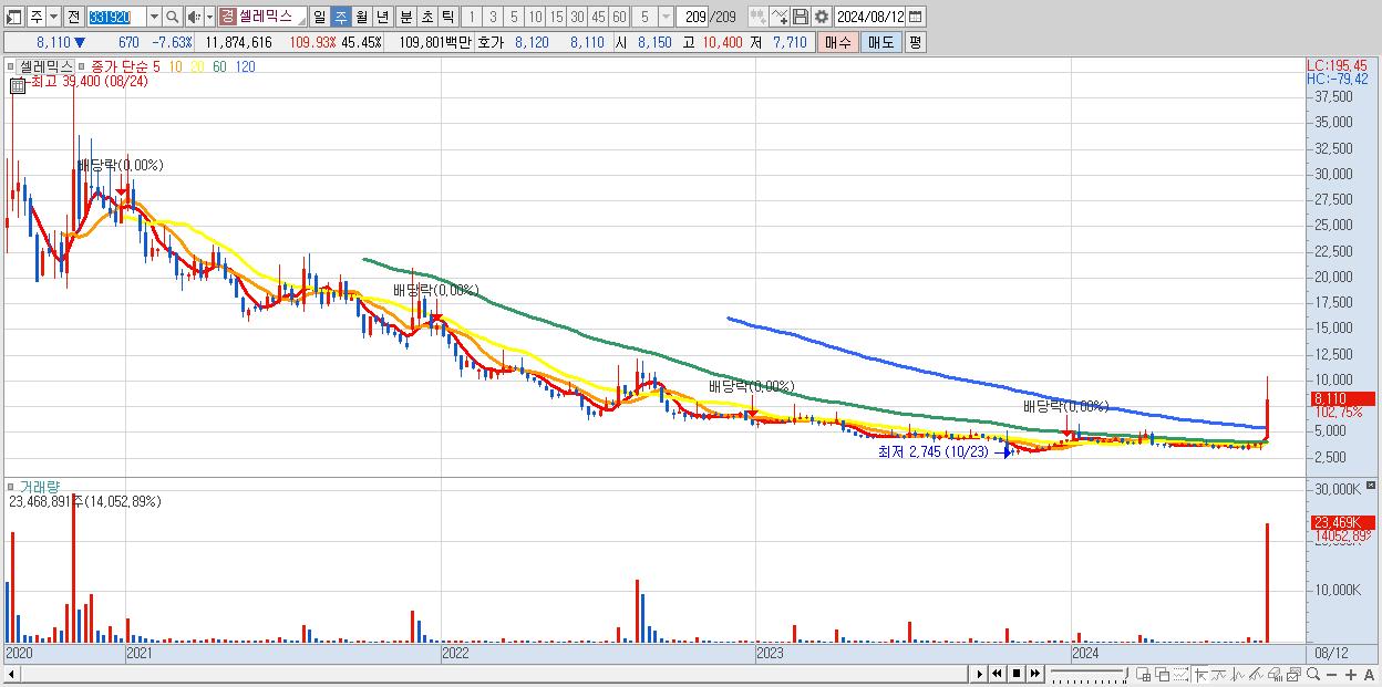 - 셀레믹스 (8,110원 ▲ 102.75% , 시총: 662억, 거래량: 23,468,891, 거래대금:2,006억)