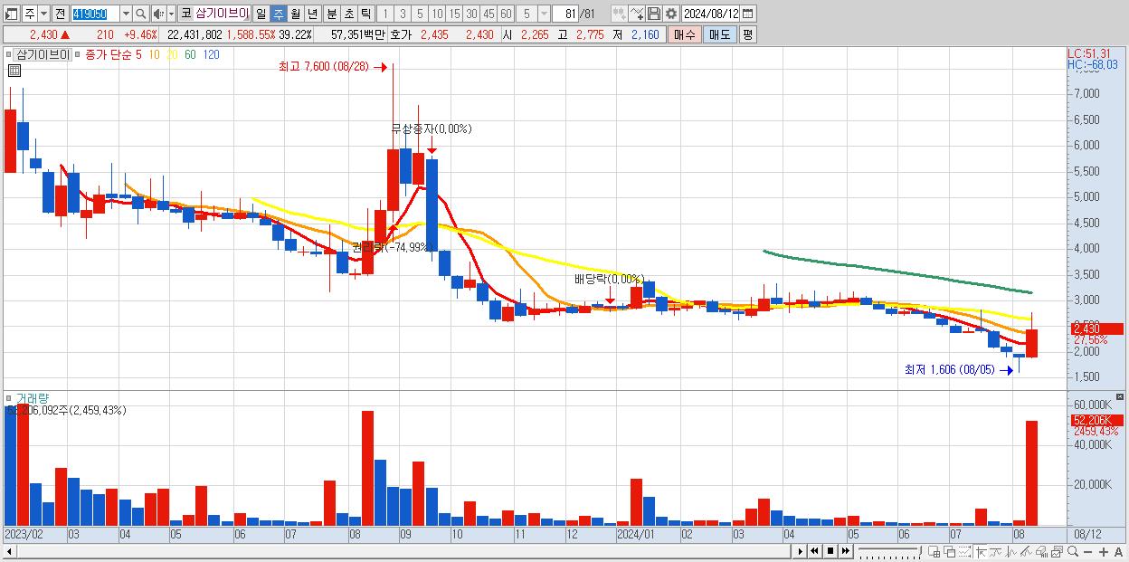- 삼기이브이 (2,430원 ▲ 27.56% , 시총: 1,390억, 거래량: 52,206,092, 거래대금:1,287억)