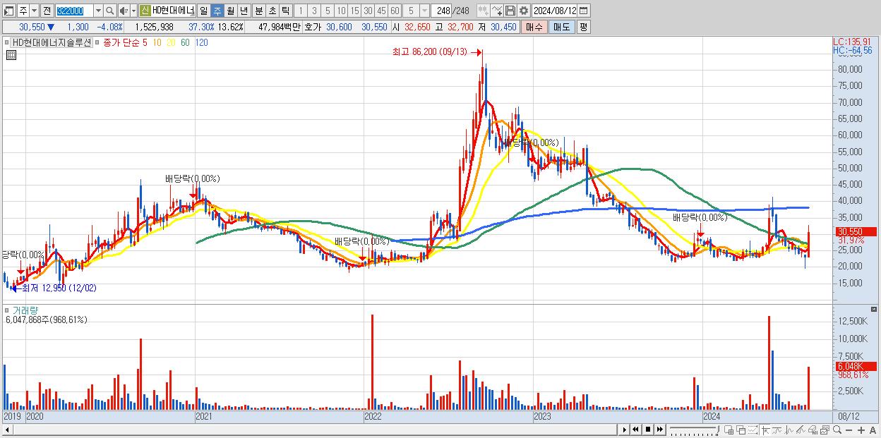 - HD현대에너지솔루션 (30,550원 ▲ 31.97% , 시총: 3,422억, 거래량: 6,047,868, 거래대금:1,806억)