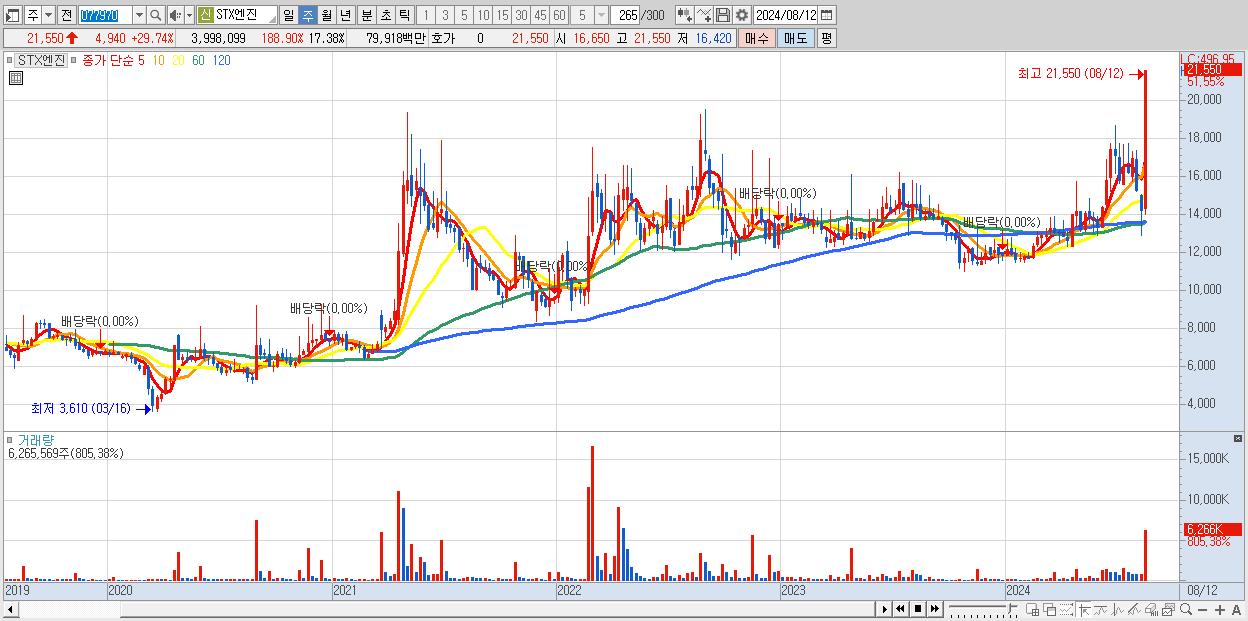- STX엔진 (21,550원 ▲ 51.55% , 시총: 4,958억, 거래량: 6,265,569, 거래대금:1,177억)