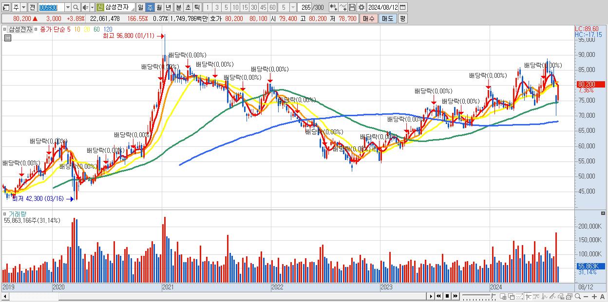 - 삼성전자 (80,200원 ▲ 7.36% , 시총: 4,787,766억, 거래량: 55,863,166, 거래대금:43,313억)