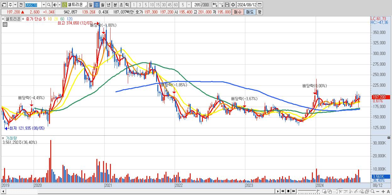 - 셀트리온 (197,200원 ▲ 0.61% , 시총: 427,966억, 거래량: 3,561,292, 거래대금:7,015억)