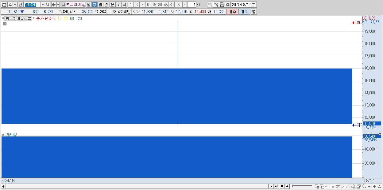 - 뱅크웨어글로벌 (11,510원 ▼ -28.06% , 시총: 1,151억, 거래량: 58,548,989, 거래대금:9,252억)