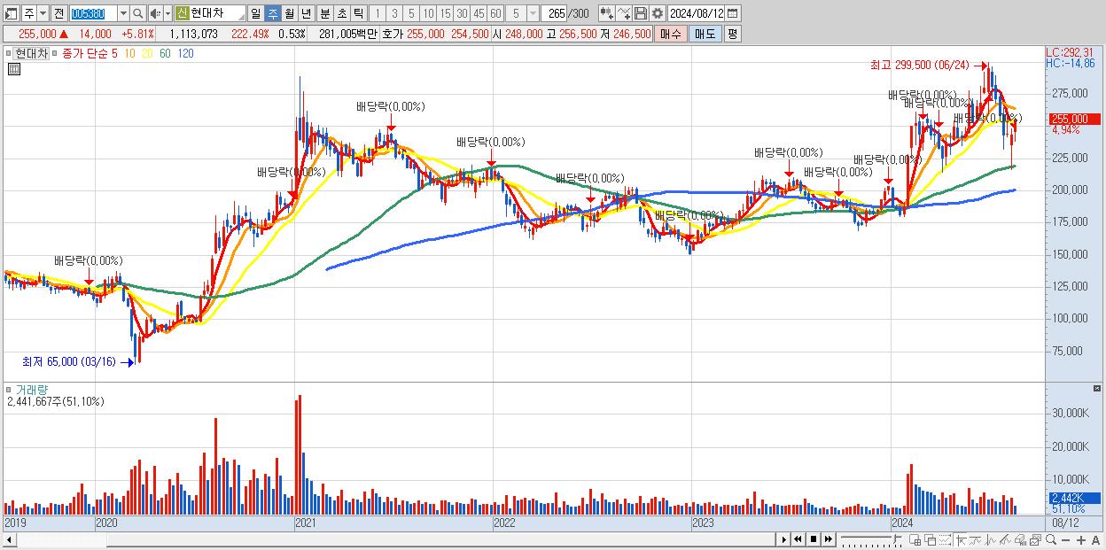 - 현대차 (255,000원 ▲ 4.94% , 시총: 534,011억, 거래량: 2,441,667, 거래대금:6,041억)