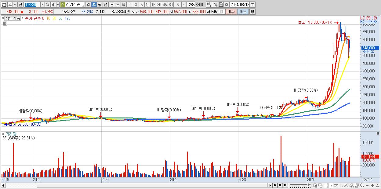 - 삼양식품 (548,000원 ▼ -8.51% , 시총: 41,281억, 거래량: 881,649, 거래대금:4,987억)