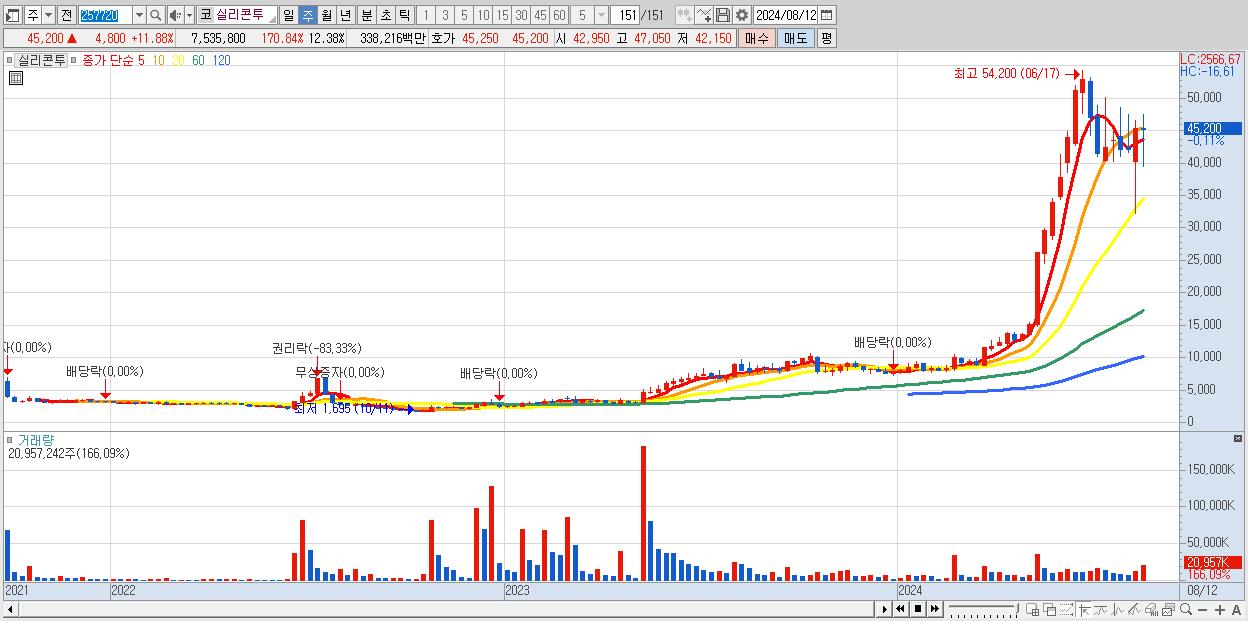 - 실리콘투 (45,200원 ▼ -0.11% , 시총: 27,515억, 거래량: 20,957,242, 거래대금:9,180억)