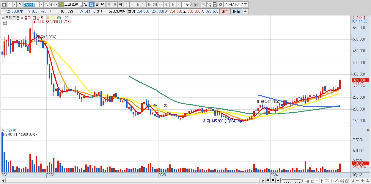 - 크래프톤 (324,500원 ▲ 10.19% , 시총: 155,404억, 거래량: 1,970,111, 거래대금:6,276억)