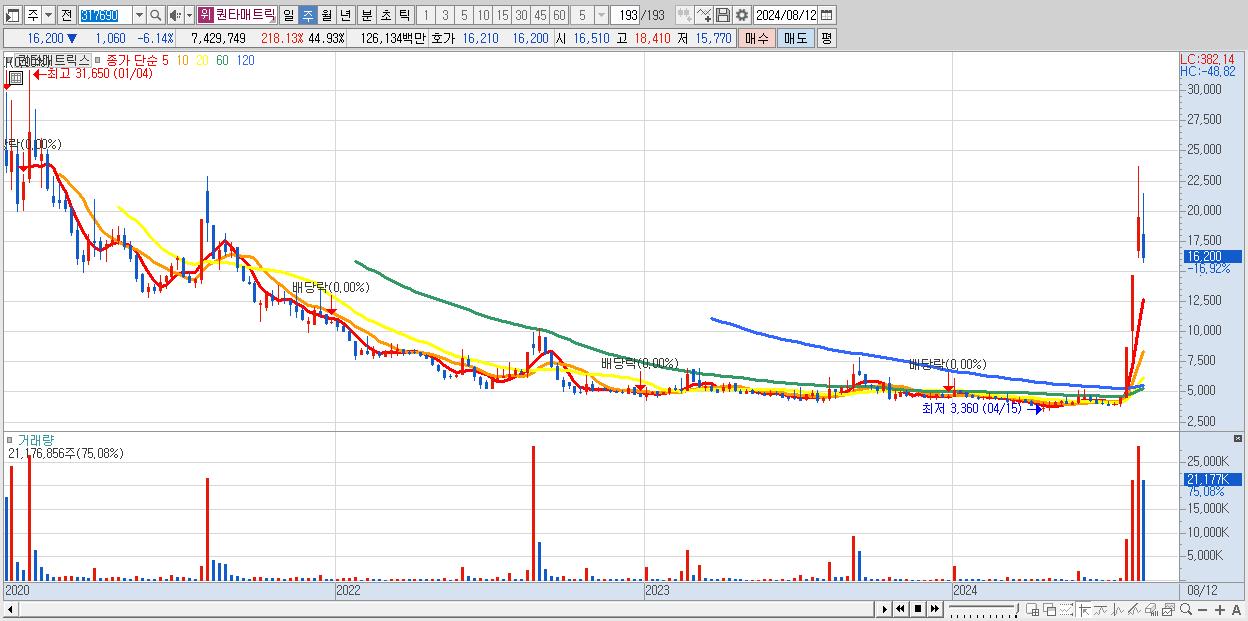 - 퀀타매트릭스 (16,200원 ▼ -16.92% , 시총: 2,679억, 거래량: 21,176,856, 거래대금:3,884억)