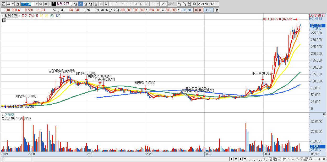 - 알테오젠 (301,000원 ▼ -0.33% , 시총: 159,977억, 거래량: 2,328,402, 거래대금:6,898억)