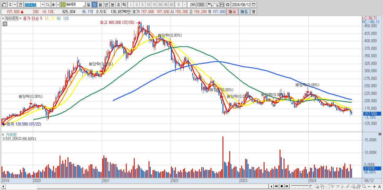 - NAVER (157,500원 ▼ -3.79% , 시총: 255,794억, 거래량: 3,531,205, 거래대금:5,587억)