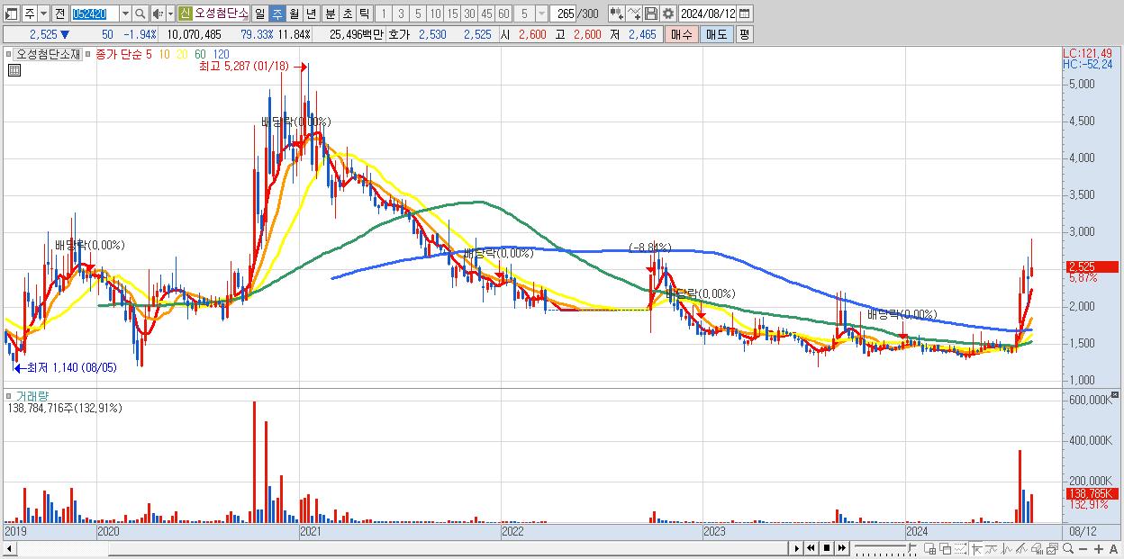 - 오성첨단소재 (2,525원 ▲ 5.87% , 시총: 2,148억, 거래량: 138,784,716, 거래대금:3,761억)