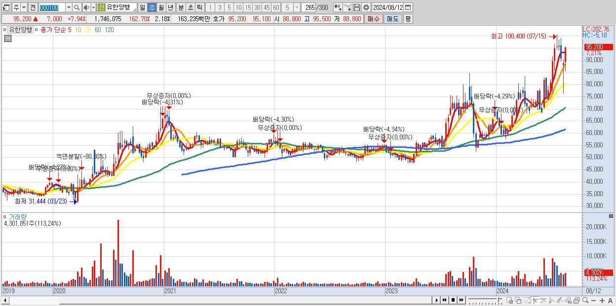 - 유한양행 (95,200원 ▲ 7.21% , 시총: 76,359억, 거래량: 4,301,851, 거래대금:3,872억)