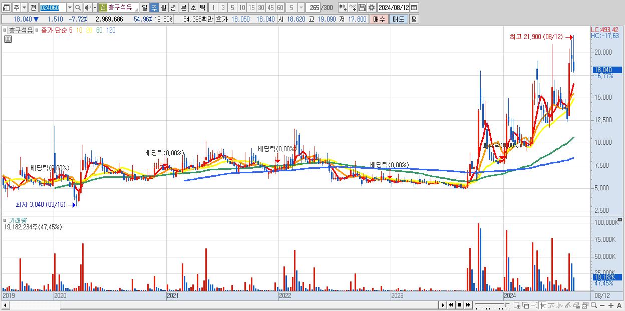 - 흥구석유 (18,040원 ▼ -6.77% , 시총: 2,706억, 거래량: 19,182,234, 거래대금:3,812억)