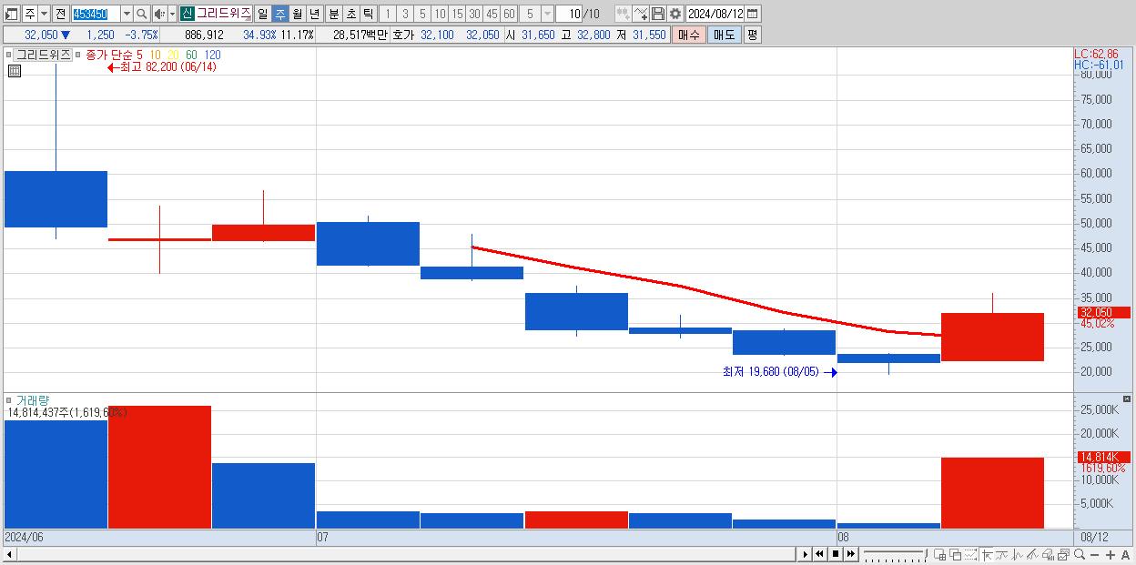 - 그리드위즈 (32,050원 ▲ 45.02% , 시총: 2,546억, 거래량: 14,814,437, 거래대금:4,734억)