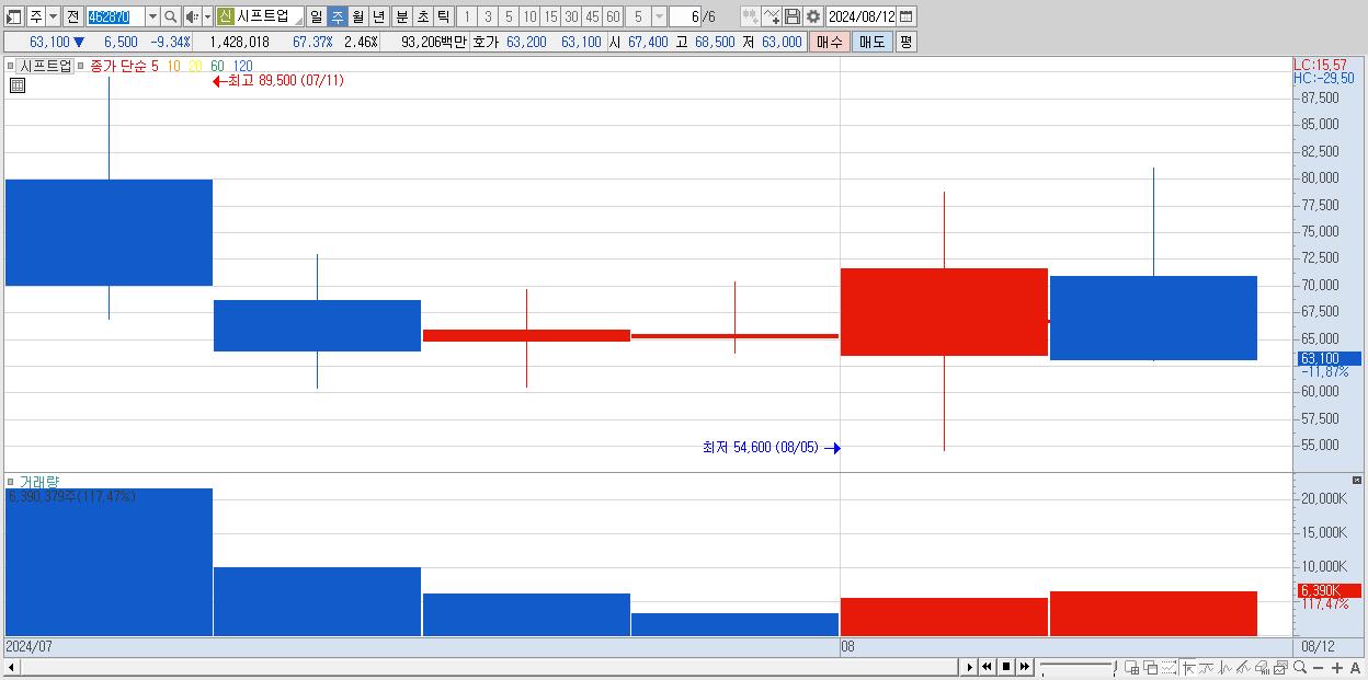 - 시프트업 (63,100원 ▼ -11.87% , 시총: 36,614억, 거래량: 6,390,379, 거래대금:4,662억)