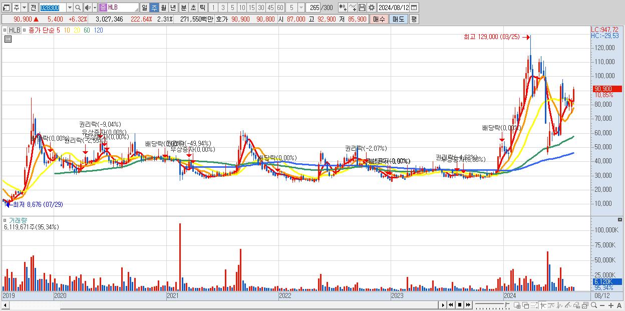 - HLB (90,900원 ▲ 10.85% , 시총: 118,938억, 거래량: 6,119,671, 거래대금:5,321억)