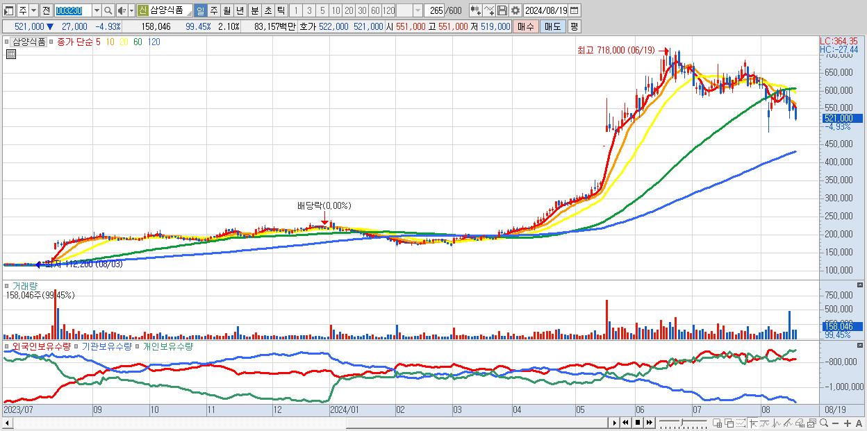 - 삼양식품 (521,000원 ▼ -4.93% , 시총: 39,247억, 외국인 순매수 거래금:118억)