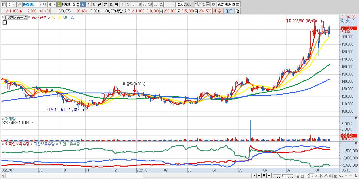- HD현대중공업 (211,000원 ▲ 3.43% , 시총: 187,311억, 외국인 순매수 거래금:184억)