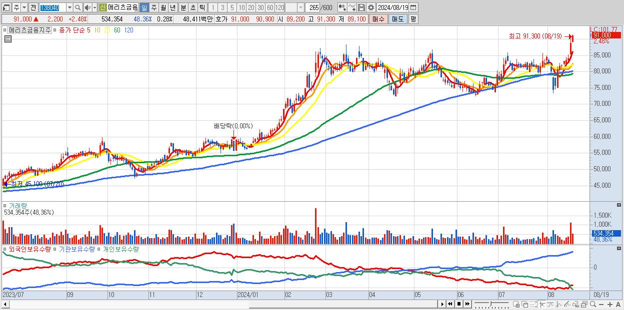 - 메리츠금융지주 (91,000원 ▲ 2.48% , 시총: 173,555억, 외국인 순매수 거래금:65억)