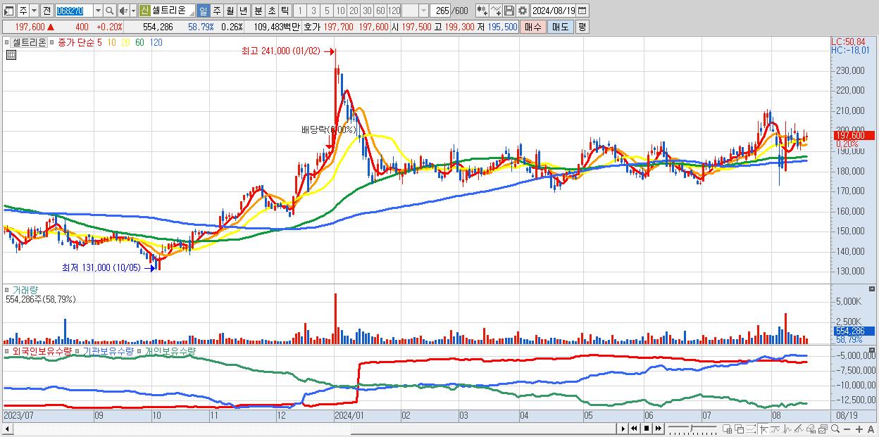 - 셀트리온 (197,600원 ▲ 0.2% , 시총: 428,834억, 외국인 순매수 거래금:70억)