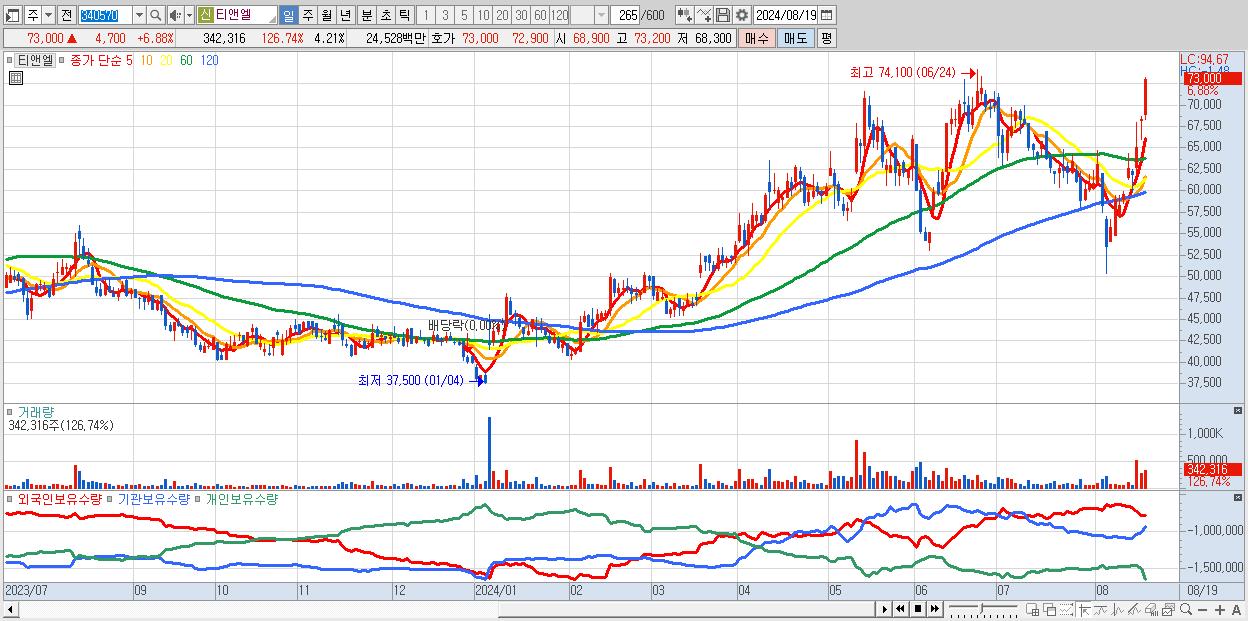 - 티앤엘 (73,000원 ▲ 6.88% , 시총: 5,933억, 외국인 순매수 거래금:70억)