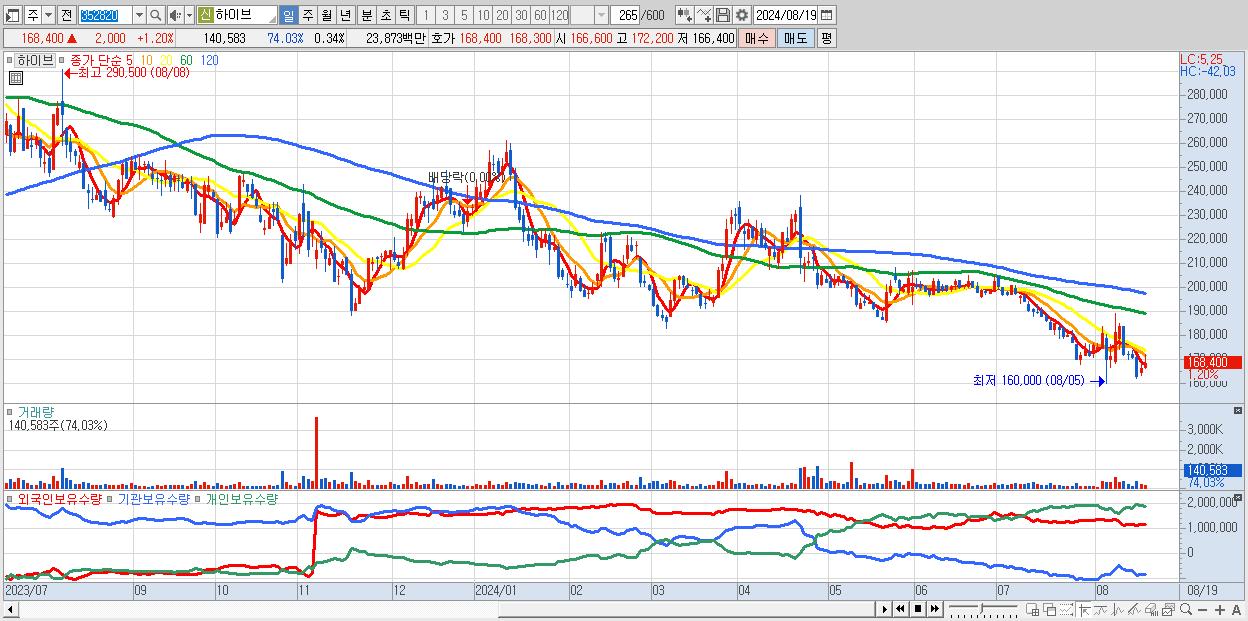 - 하이브 (168,400원 ▲ 1.2% , 시총: 70,142억, 외국인 순매수 거래금:42억)