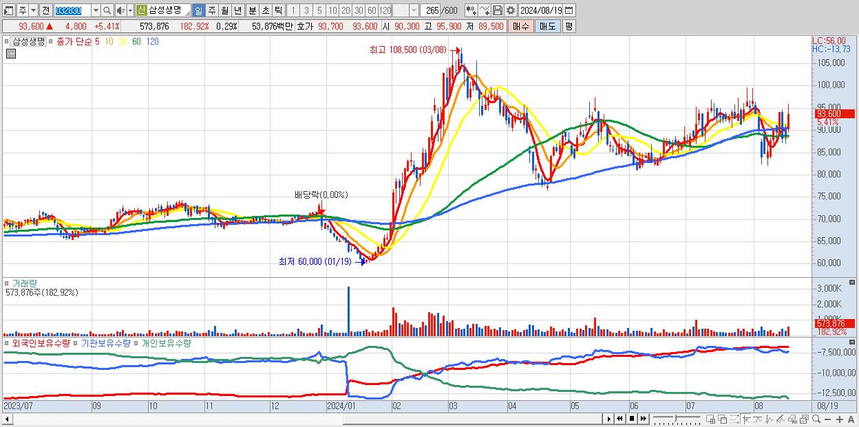 - 삼성생명 (93,600원 ▲ 5.41% , 시총: 187,200억, 외국인 순매수 거래금:179억)