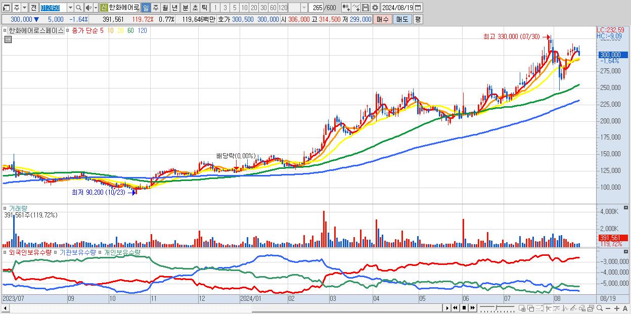 - 한화에어로스페이스 (300,000원 ▼ -1.64% , 시총: 151,890억, 외국인 순매수 거래금:64억)